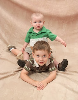 On Sunday, we went ahead and had Gage's portraits made for his one-year milestone. We discovered very quickly that he is not nearly as camera-happy as his brother! Zane has always smiled without effort, and has always been a ham in front of the camera. Gage, on the other hand, looked at the guy taking the pictures like he was a wacko! You could seriously see Gage checking this guy out. But we like the portraits, and they really did capture Gage's personality. I mean, that's just how he is. He has always been this serious thinker, and in that way, I'm glad the portraits turned out like they did. We only ordered three poses, but all of the shots came on disc, so I have put a bunch of them on here. Oh, and as you can tell, Zane really wanted to be in some pictures, so the photographer went ahead and took some of Zane, too. And they turned out very cute! Again, Zane loves the camera, so he is always smiling for it. In the couple of shots that Gage actually IS smiling, he's looking at me play "Peek-A-Boo" with him. LOL